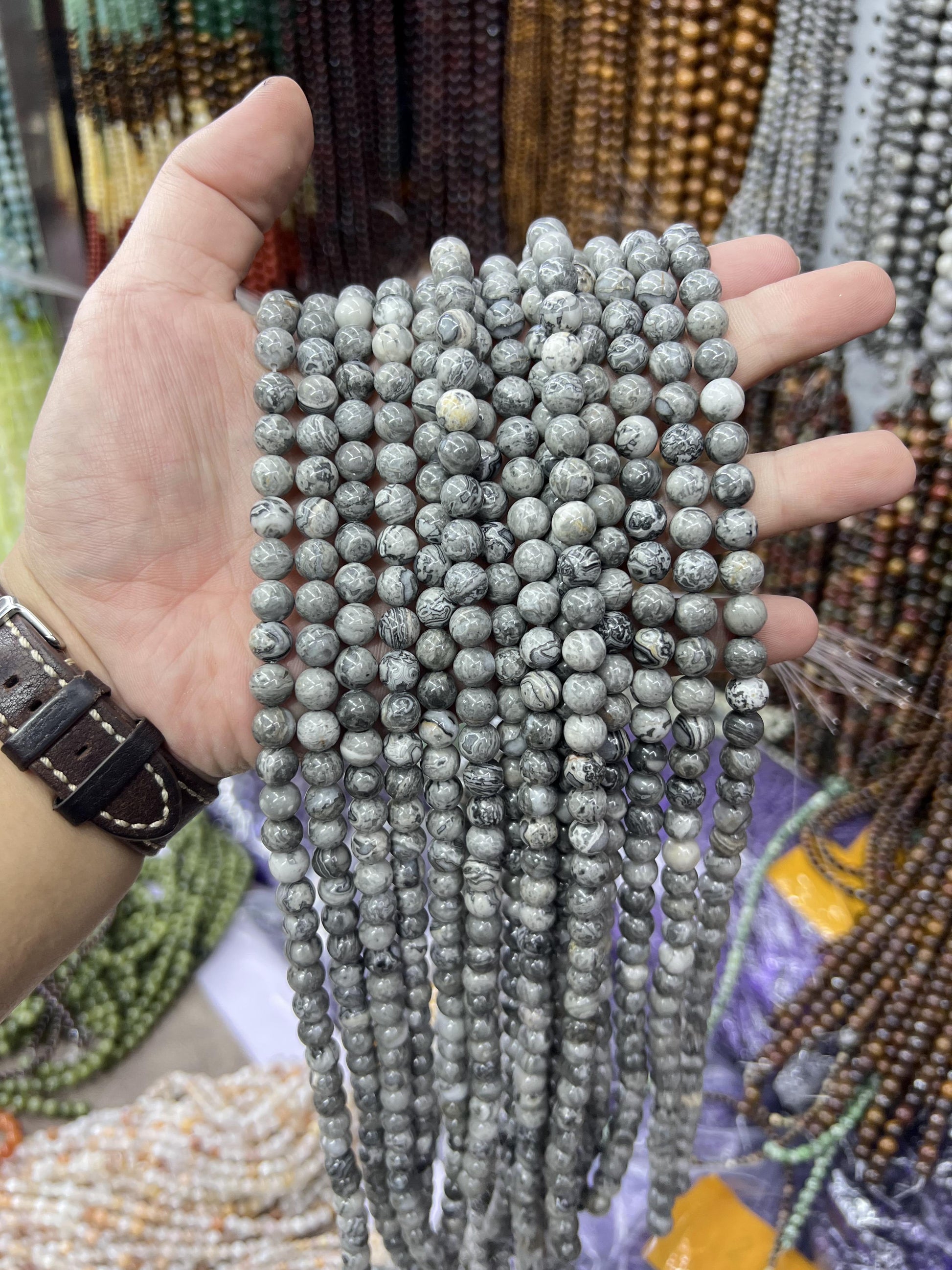 8mm about 1.0mm hole, about 45 beads per strand